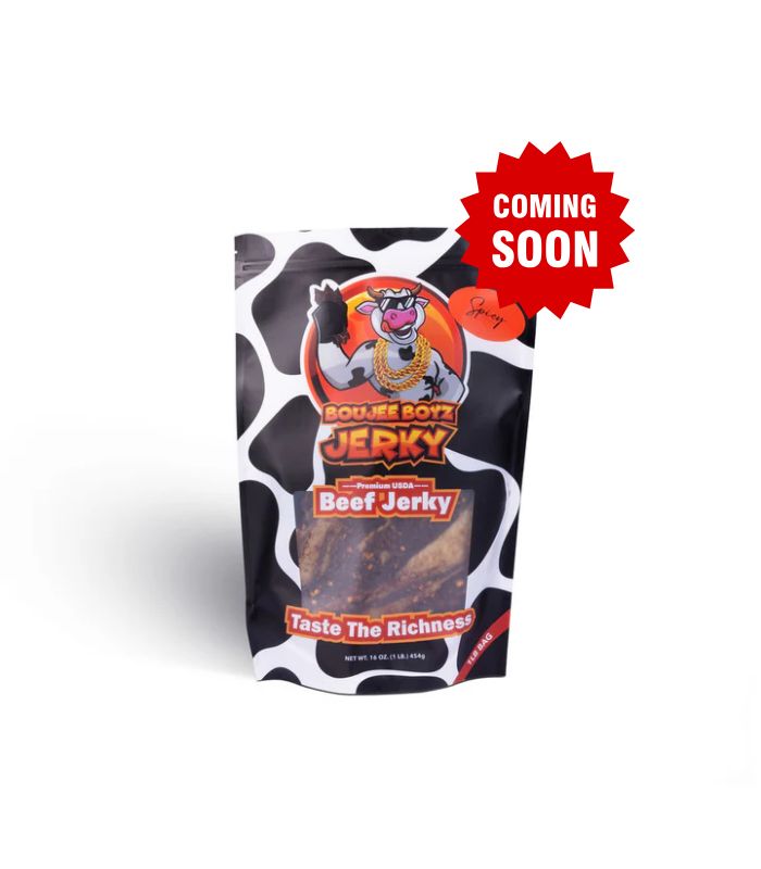 1/2 lb or 1 lb bag of jerky, marinated in our secret sweet garlic Boujee Boyz recipe and seasoned with red chili flakes.